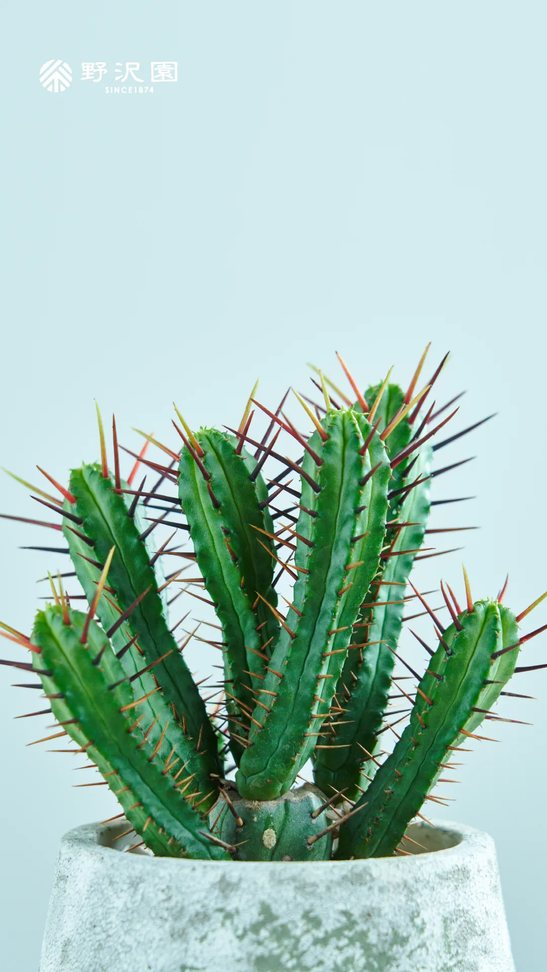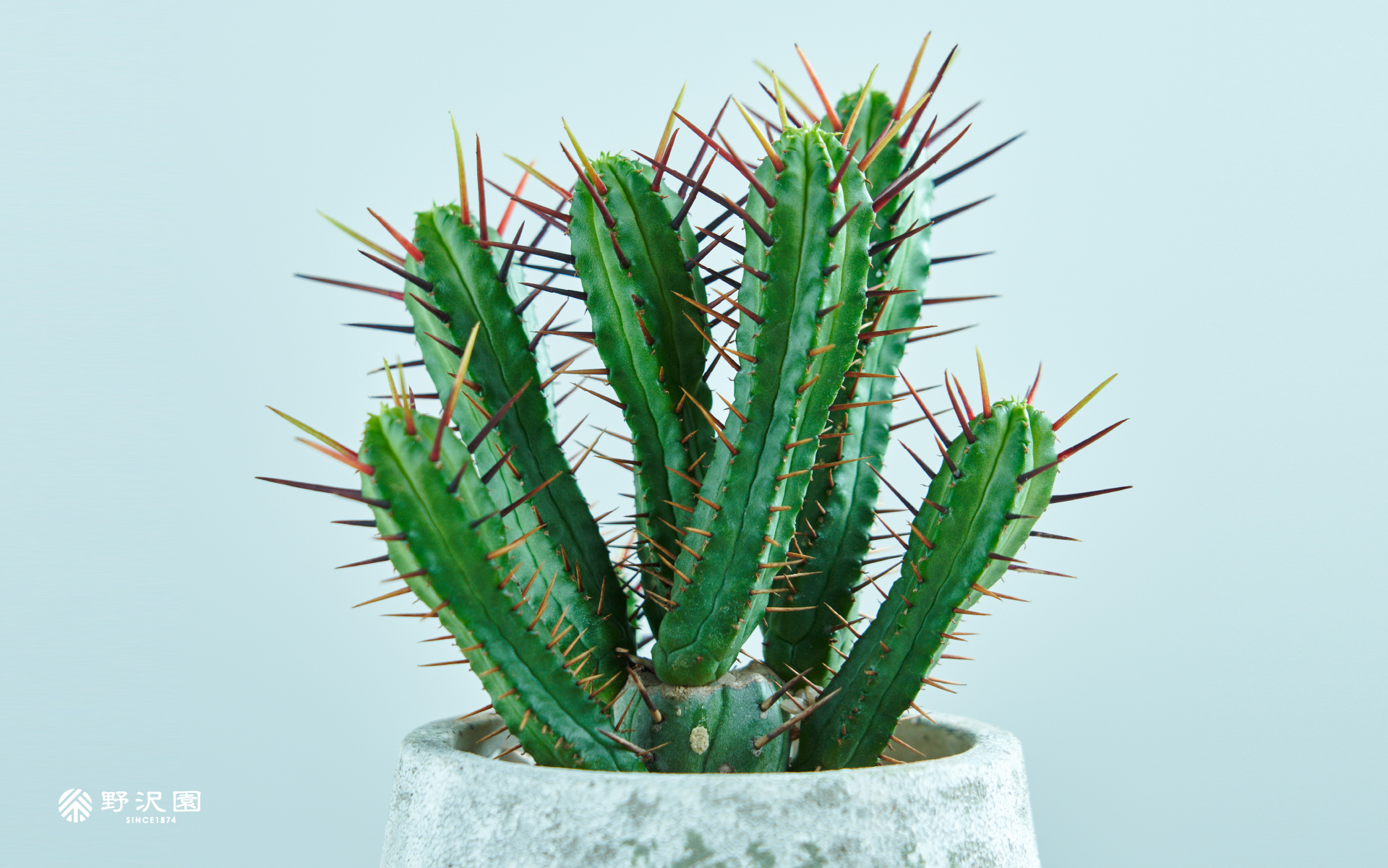 乾燥にも強いため育てやすく、おすすめのインテリアグリーンです。日当たりの良い場所に置くとトゲの色がより深く発色し、美しさが増します。冬から春にかけては小さな黄色い花を咲かせ、その繊細な姿も楽しめます。