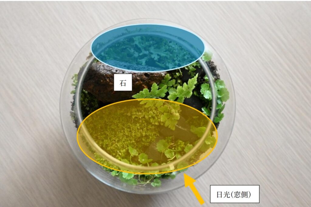装飾用の石を境に日光を好む植物を手前に、日陰を好む植物を後ろに配置し、ひとつの小さなテラリウム内でも環境に変化を付けてみました。