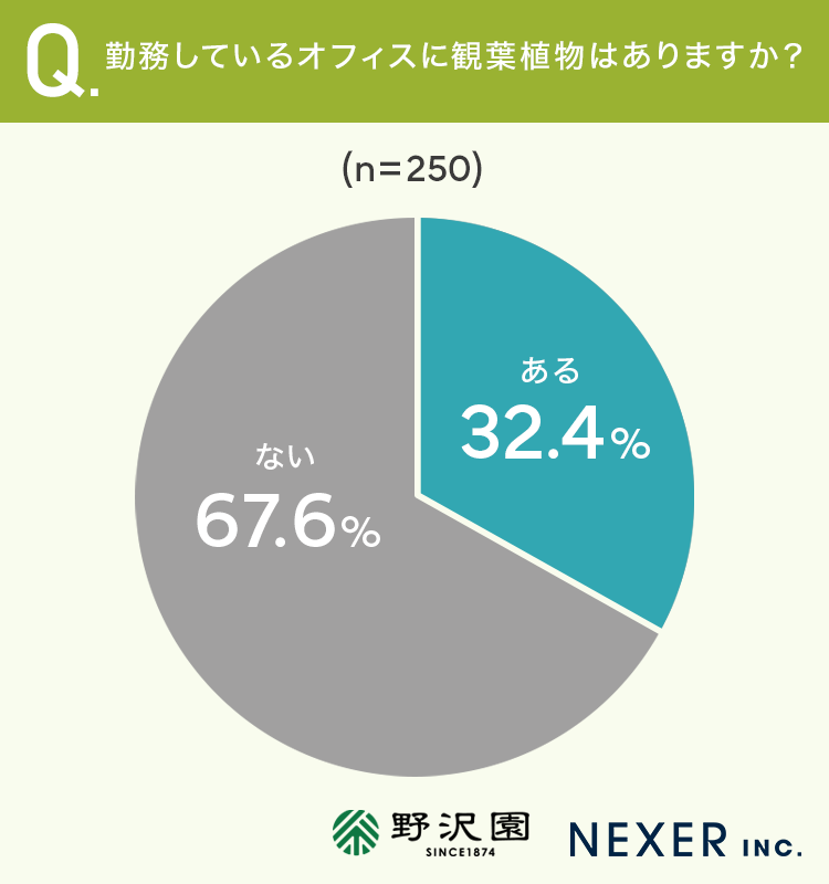 「勤務先のオフィスに観葉植物は設置されていますか」という質問に対し、32.4%の回答者が「設置されている」と回答しました。オフィスに緑を取り入れる取り組みはある程度進んでいるようです。