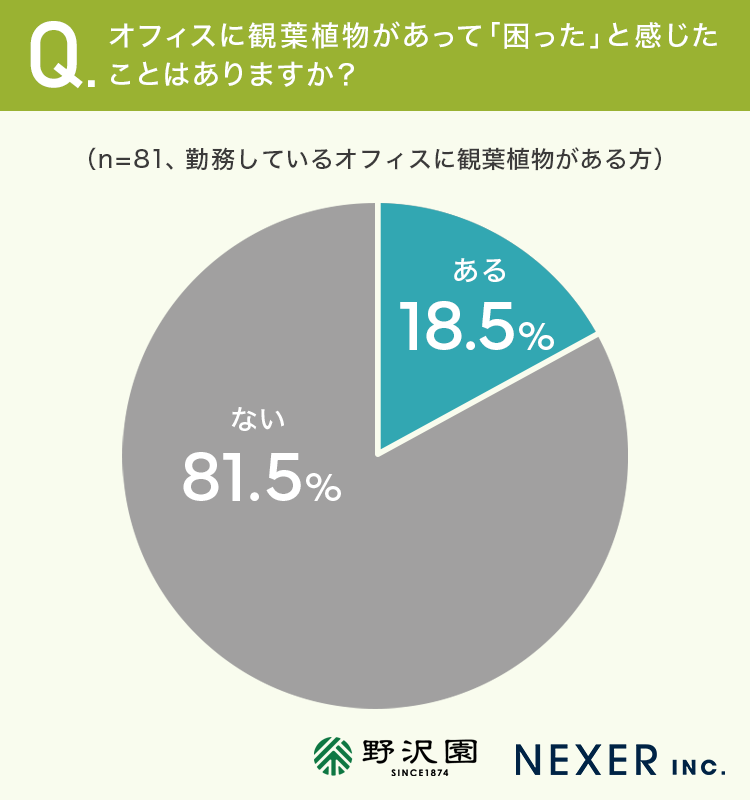 観葉植物が設置されているオフィスのうち、18.5%が「管理に困ったことがある」と回答しました。