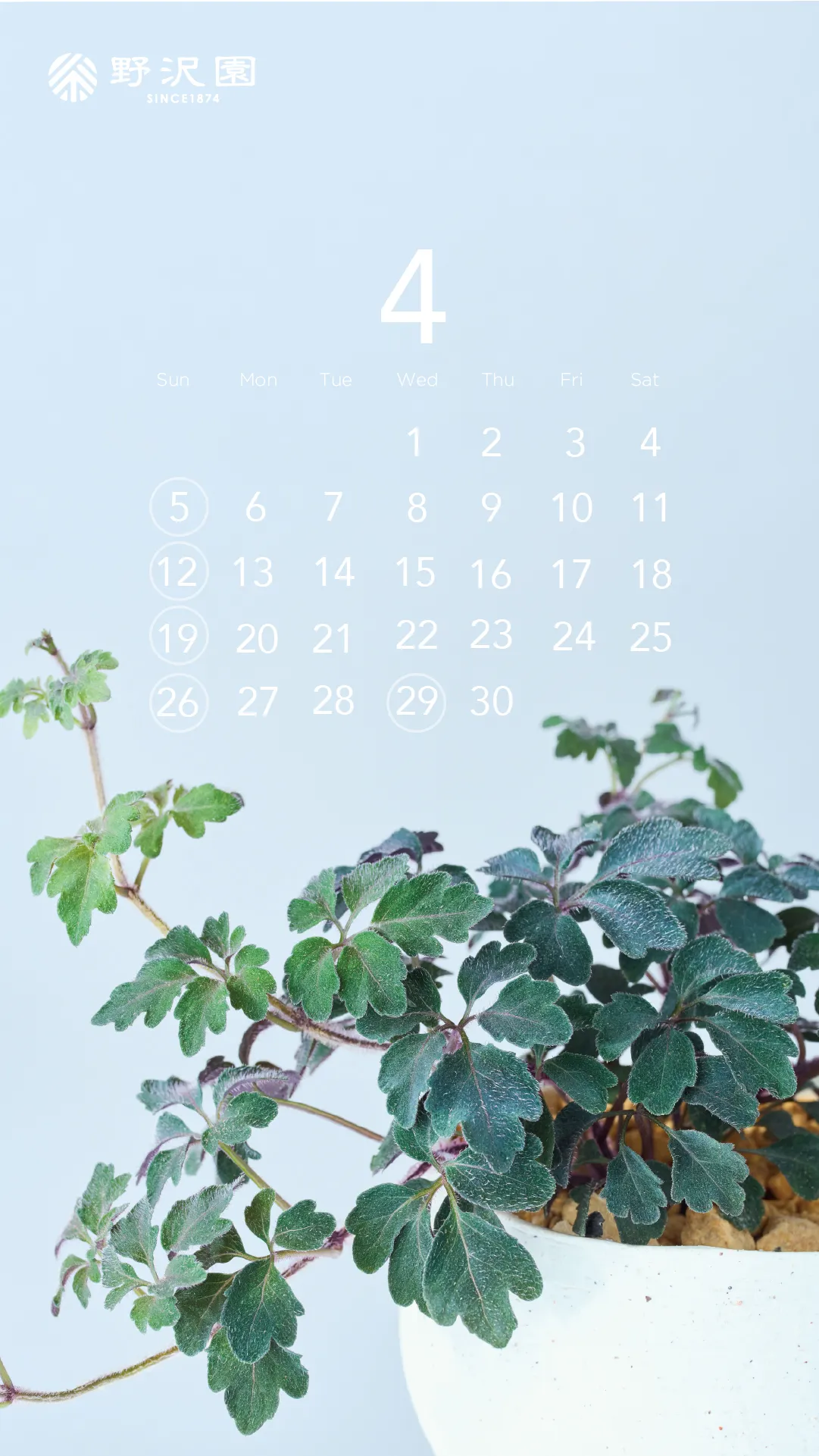 2026年4月分の野沢園オリジナル植物カレンダーを作成しました。PCやスマホにダウンロードしてぜひご利用ください。