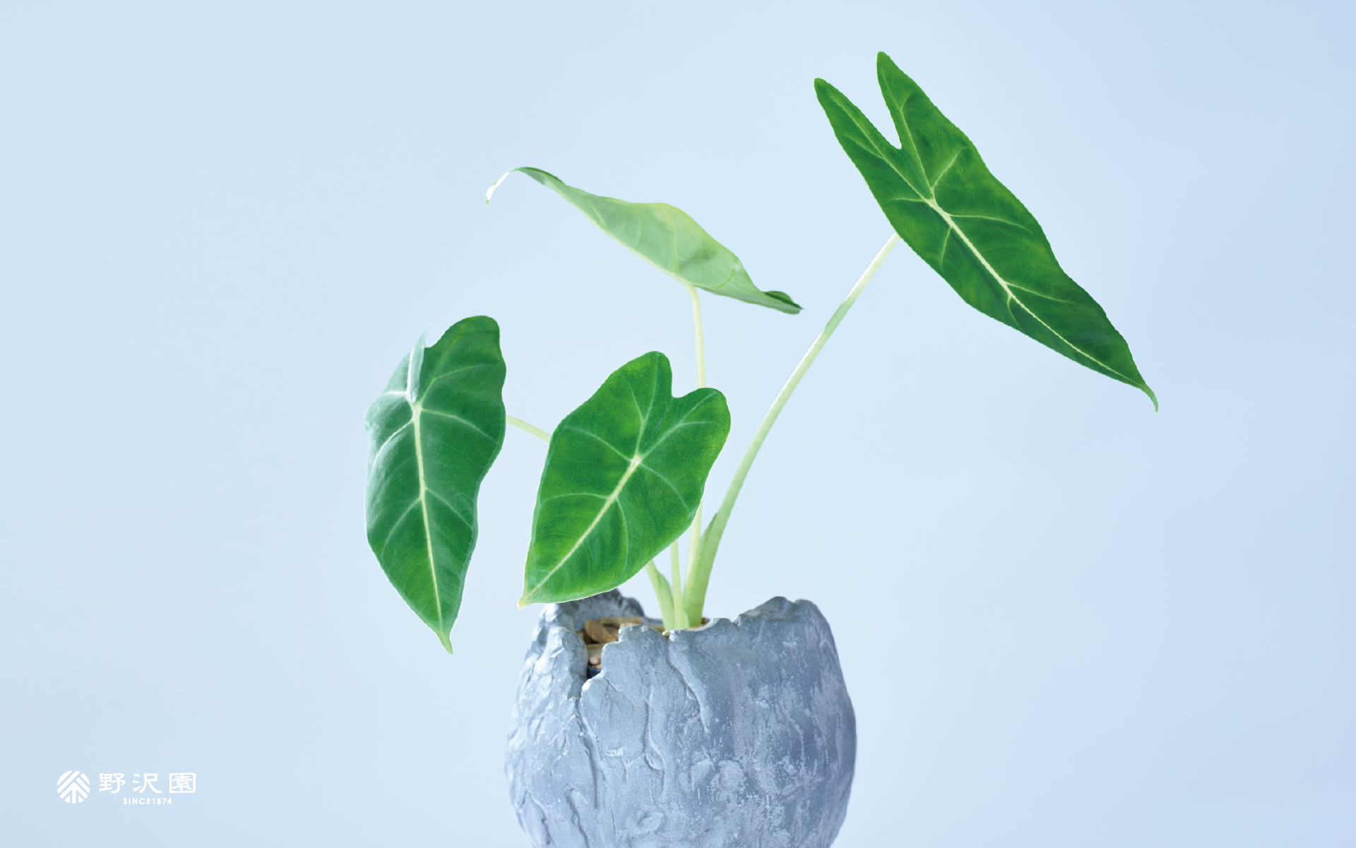 5月の植物は「アロカシア・グリーンベルベット(Alocasia Green velveet)」です。サトイモ科クワズイモ属の植物で、熱帯アジアやオーストラリアが原産。葉の色は深い緑色、ベルベットのような質感を持つのが特徴です。成長すると50㎝ほどになります。室内の栽培に適しており、コンパクトで観葉植物として人気があります。