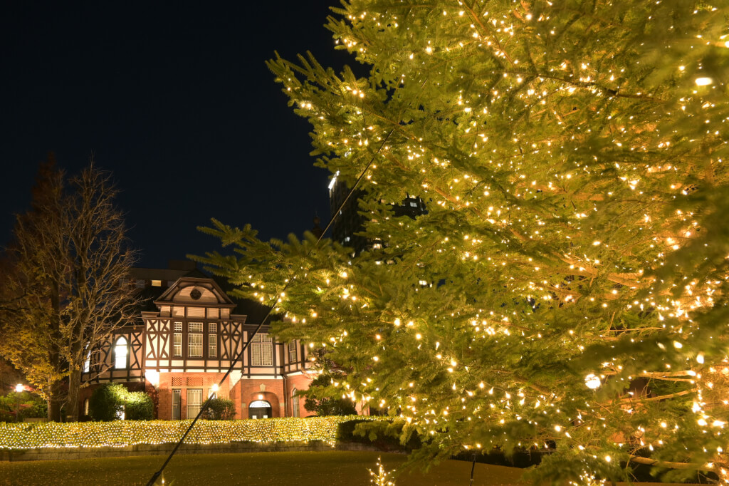 正門から伸びるイチョウ並木の道にもイルミネーション。イチョウの黄色い落ち葉と相まって美しい光景が広がります。